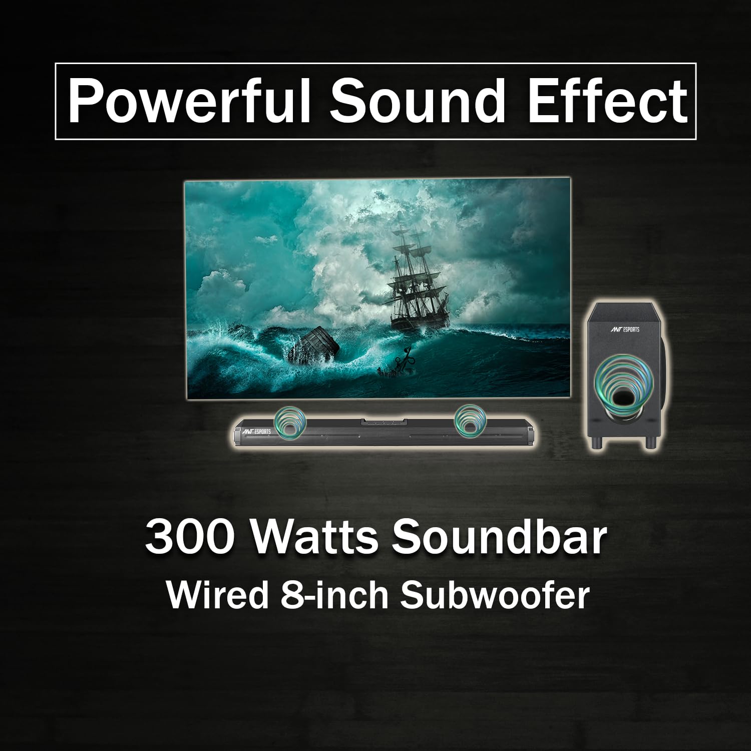 Ant Esports SBW300 300 watts Soundbar with Wired 8-inch Subwoofer I 2.1-Channel 5.0 Bluetooth, I TV/Projector/Gaming, HDMI/Optical/AUX/USB/TF I FM Radio I Wall Mountable, Remote Control –Black