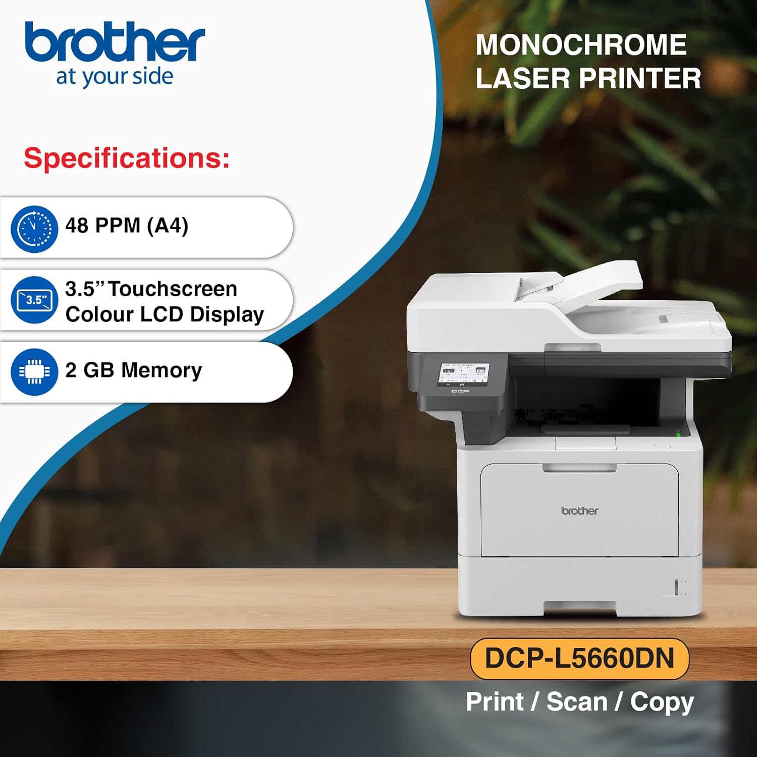 Brother DCP-L5660DN (New Launch) Auto Duplex Laser Printer, 48 PPM, Dual Scanning, Print Scan Copy, 3.5″ Touch Screen Display, 70 Pages ADF, LAN, 250 Sheet Tray, 11000 Pages Toner, Free Installation