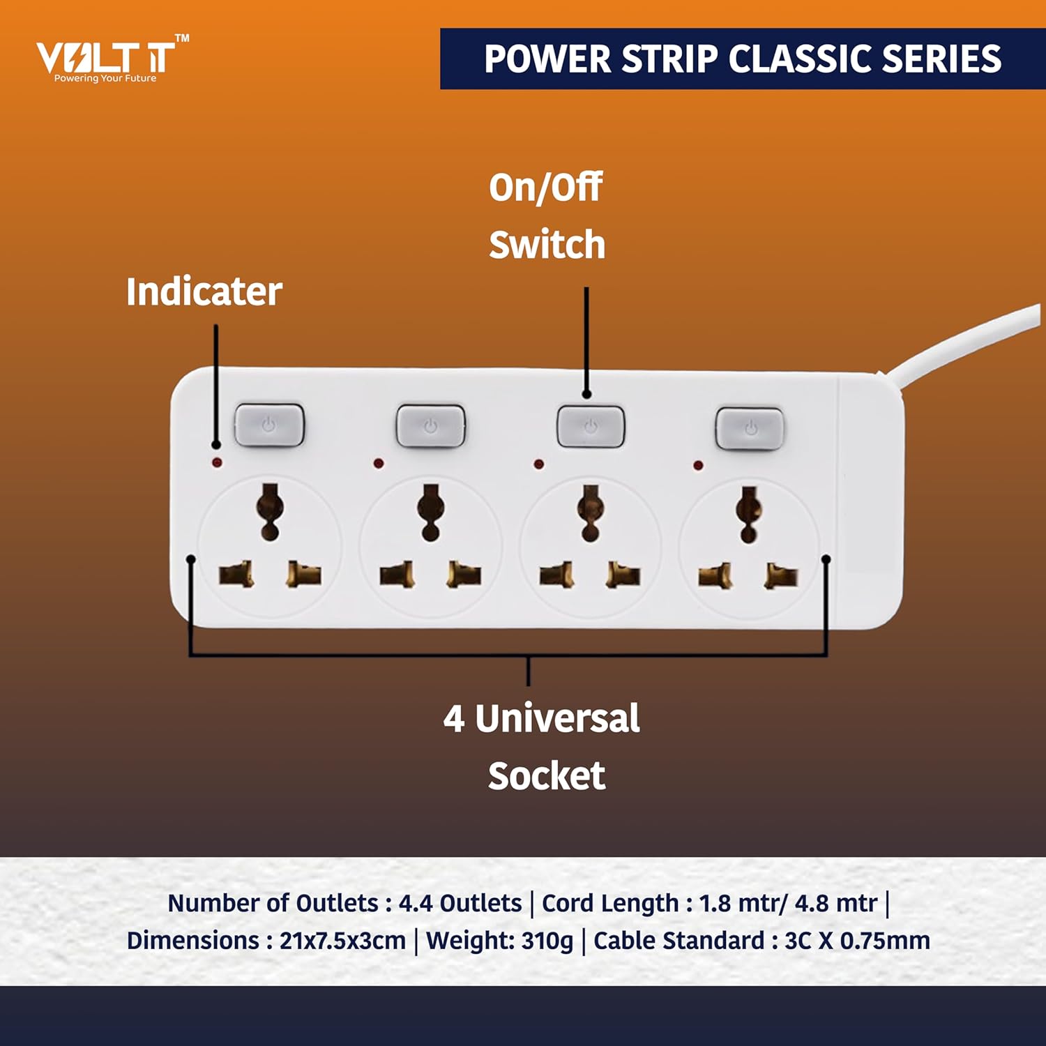 VOLT IT (SP – 404-1.8 mtr) Extension Board 10Amp Output 250 Volts with 1.8 Mtr Extension Cord & Surge Protector | Multi Switch, Safety Shutter, 4 International Sockets | Multi Plug